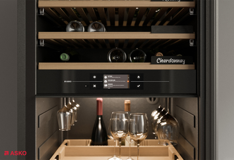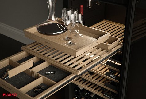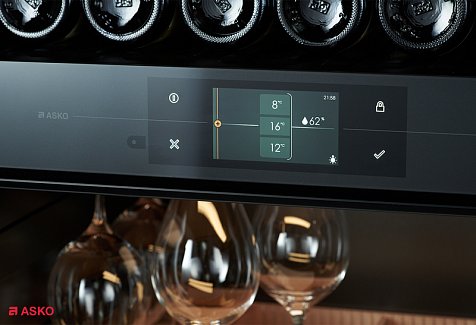 Модель предназначена для хранения до 190 бутылок вина (0,75 л) на деревянных стойках с мягкими телескопическими направляющими. Высококачественное стекло двери с УФ-фильтром защищает напитки от вредных ультрафиолетовых лучей. Для оптического считывания этикеток винных бутылок используется сенсорный дисплей. Он собирает и хранит данные, также предназначен для дальнейшего ведения инвентаря винного шкафа Аско WCH3119422G. Бутылки и декандеры (графины и другие ёмкости) здесь стоят вертикально. Чтобы они не упали во время открывания и закрывания двери, есть особые держатели. В выдвижном ящике хранятся аксессуары, в том числе специальные приспособления: аэраторы (насадки для разлива по бокалам), струеры (дозаторы), штопоры и тому подобные изделия.