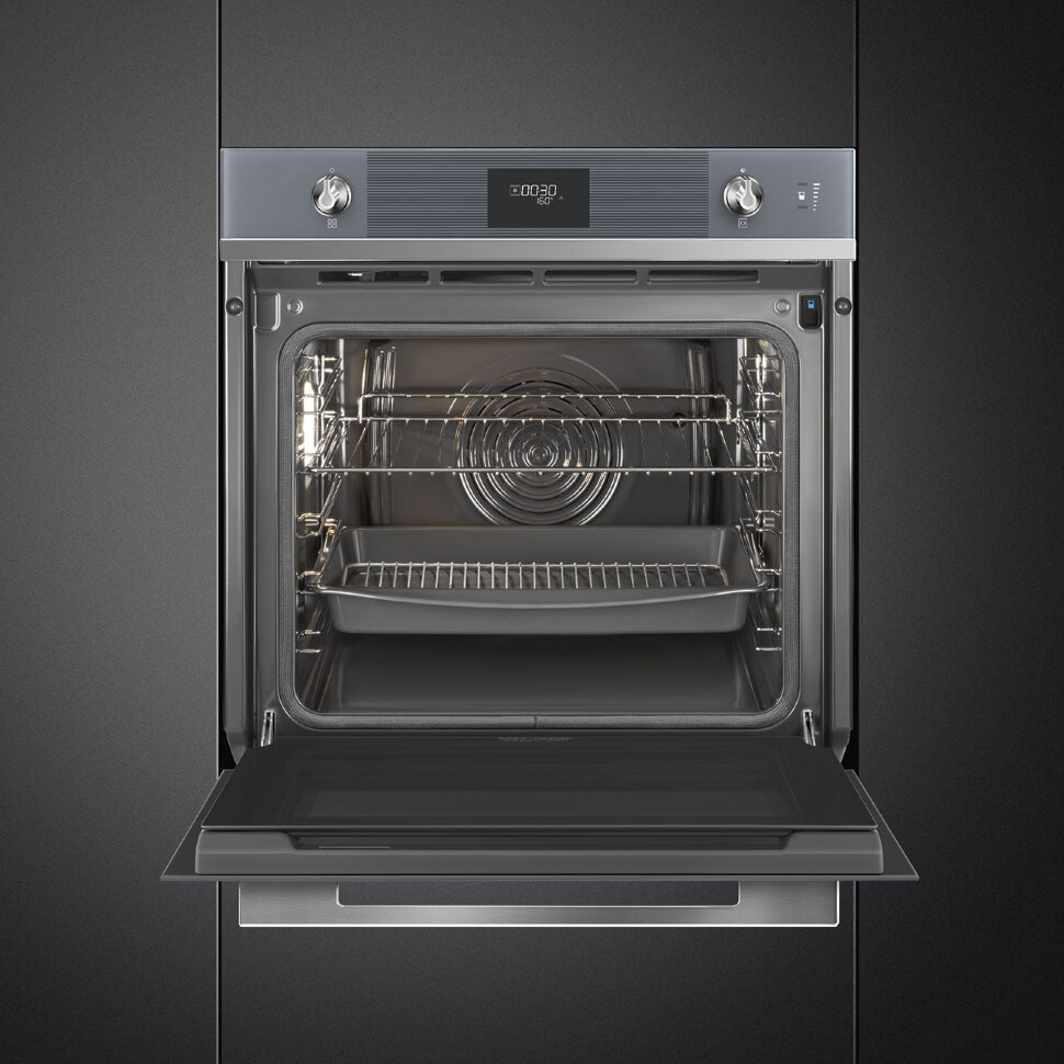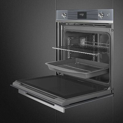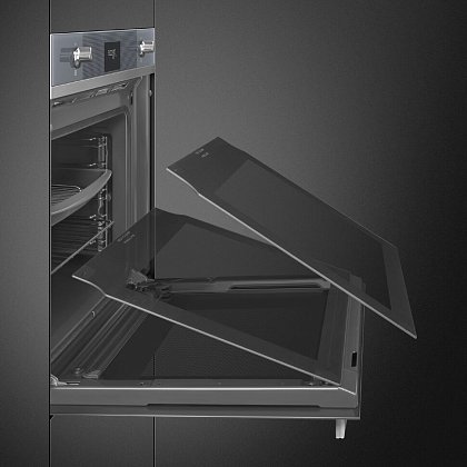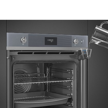 Духовой шкаф Smeg SOP6101S2S из коллекции Linea выполнен в цвете «Серебристое стекло Stopsol». Прибор предусматривает в себе пиролитическую систему очистки, которая при температуре около 500°C выжигает любые загрязнения — по завершении режима останется только протереть дно камеры мягкой тряпкой. Благодаря технологии подачи пара LITE-steam к некоторым функциям можно добавлять пароувлажнение (20 или 40% интенсивности пара), что обеспечивает наилучшие результаты приготовления.